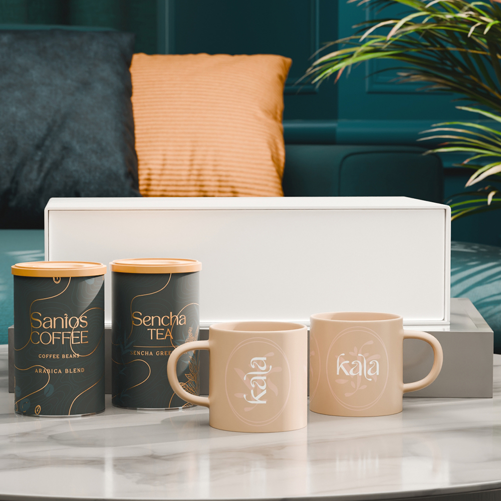 Subtelny duet dwóch kubków Gaia o zrównoważonej, naturalnej kolorystyce, idealnej do podkreślenia dbałości o etykę i ekologię. Zestaw uzupełniony o wyselekcjonowaną kawę "Santos Coffee" oraz aromatyczną herbatę "Sencha Tea" w eleganckich puszkach. Całość pakowana w ekskluzywne, śnieżnobiałe opakowanie zamykane na magnes.